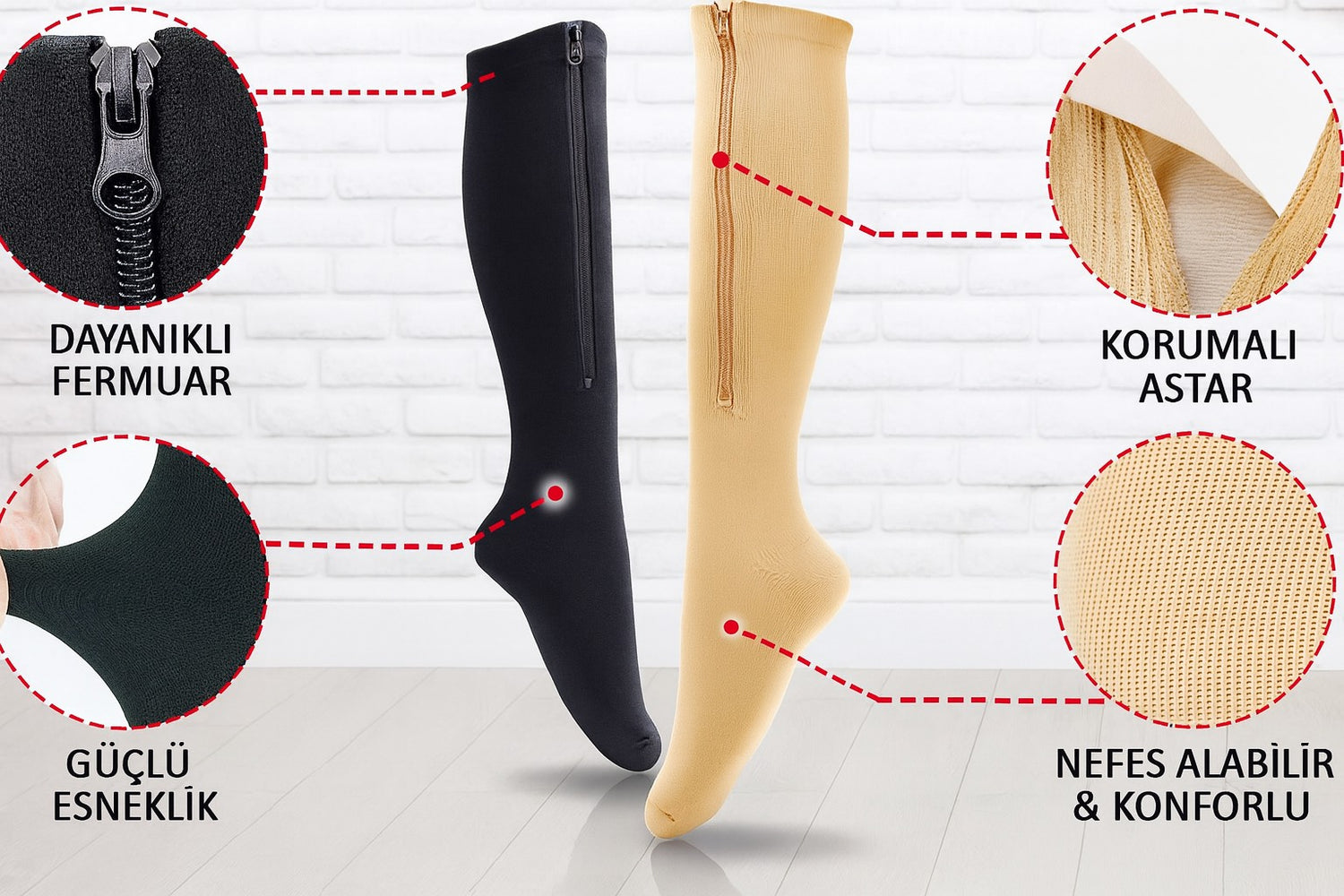 Bu kompresyon çorabı uzun zamandır yaşadığım giyme zorluklarını tamamen çözdü.Fermuarı sayesinde çorap bacağıma neredeyse hiç güç harçamadan yerleşiyor ve saniyeler içerisinde doğru konuma oturuyor.Dayanıklı ve yumuşak kumaşı gün boyu rahatlık sağlarken dengeli kompresyon seviyesi şişlik ve yorgunluğu belirgin şekilde azaltıyor. Daha önce denediğim modellerde hissetiğim sıkma, baskı ve rahatsızlık burada yok. Hem pratiklik hem kalite olarak aradığım farkı sonunda bu üründe buldum.